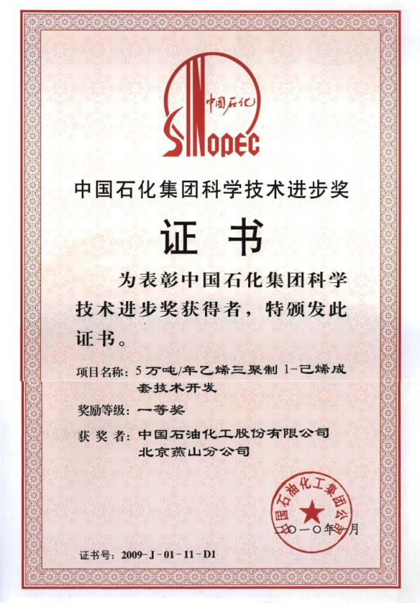 图1 “5万吨/年乙烯三聚制1-己烯成套技术开发”获得中国石油化工集团公司科学技术进步一等奖
