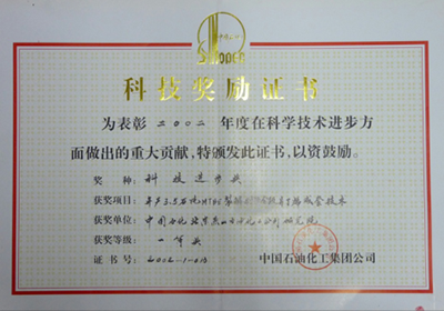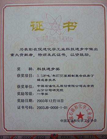 图3 “年产3.5万吨MTBE裂解制聚合级异丁烯成套技术”获得2002年度中国石油化工集团公司科技进步一等奖。