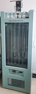 比重测定装置由恒温浴箱,带刻度密度梯度管,玻璃浮子组成(玻璃浮子需要经过计量校准)。玻璃浮子事先放置在密度梯度管中,管中注入密度连续梯度变化的液体后,漂浮在梯度液中,根据玻璃浮子在梯度管中的位置和浮子的密度绘制密度和高度曲线。将被测样品置入梯度管中,稳定后,根据样品在梯度管中的位置和密度高度曲线图,即可计算被测样品的密度。