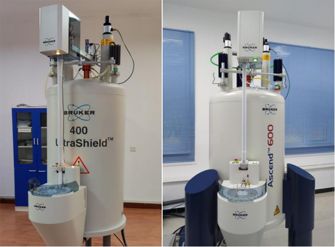 配备400兆和600兆两台液体核磁共振波谱仪,均配有最新一代AVANCE NEO机柜、高灵敏度iProbe宽带探头和带预加热功能的自动进样器,除可以进行常温液体实验外,还可以进行高温液体核磁实验。600兆仪器配备10mm双核探头和4mm固体探头,可以对低含量有机物和固体材料进行分析。